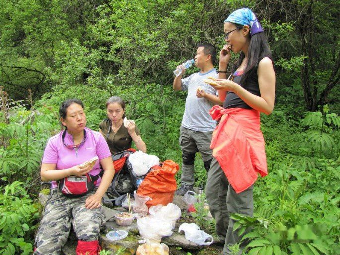 在浪费了半天时间爬山却离水源越来越远的时候,大家都兴致勃勃的补充能量。几乎没有人顾忌吃相的问题。