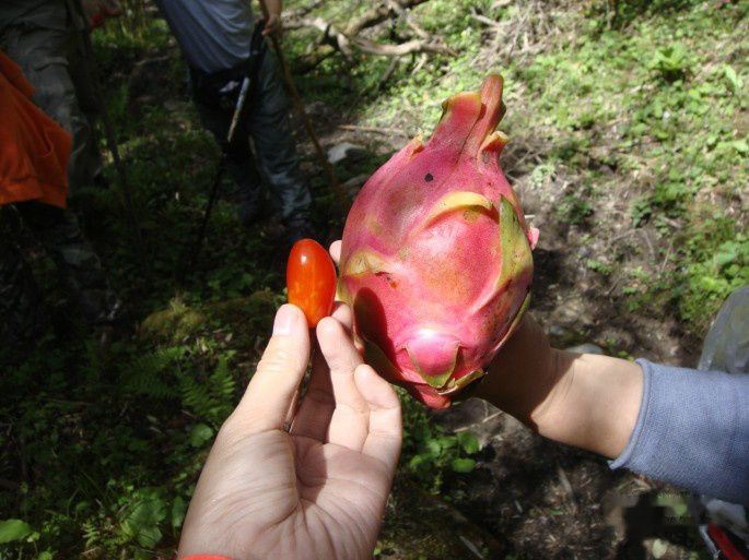 大家一直轻装上阵的,只有蒲姐背着包,秘密揭晓——蒲姐为我们背着火龙果!如此高海拔,如此劳累,如此口渴的情况下,蒲姐的火龙果,可乐哥的小番茄,那个爽啊!