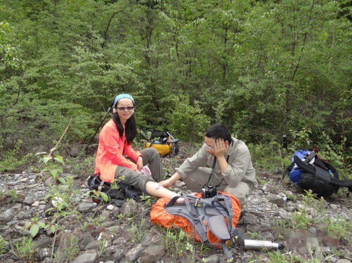 往回走的路上,我一直比较快。突然觉得右腿凉飕飕的,拉开半腿的拉链,发现有血痕。蒲姐马上帮我挤了几滴血出来,发现有个小小的洞,我感觉不痛也无异物,于是继续走。在大家走回有争议的岔路口后,我仍觉得有点凉快,发现腿还在流血,前后时间已经至少有十多分钟了