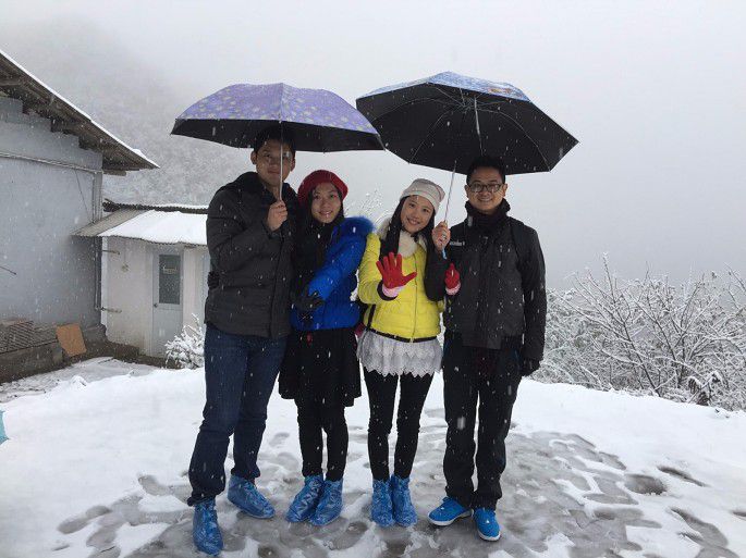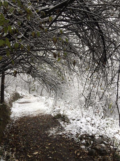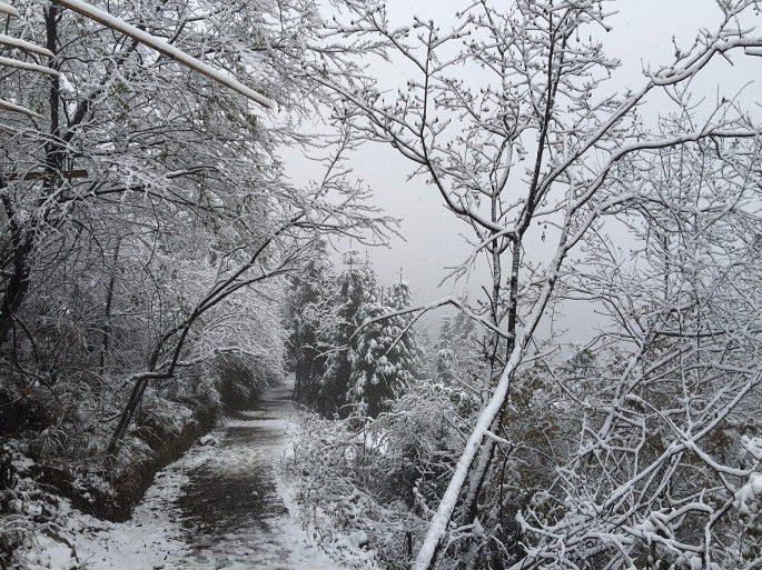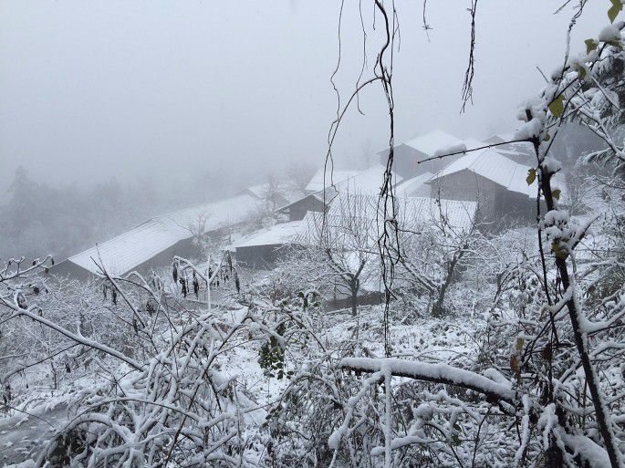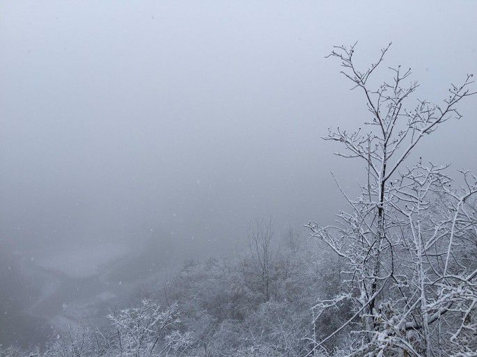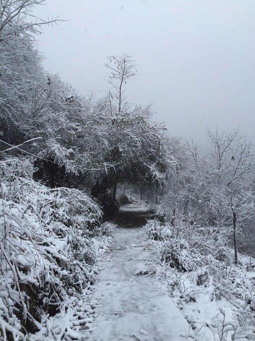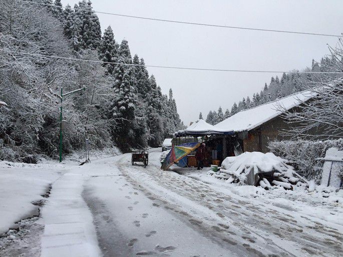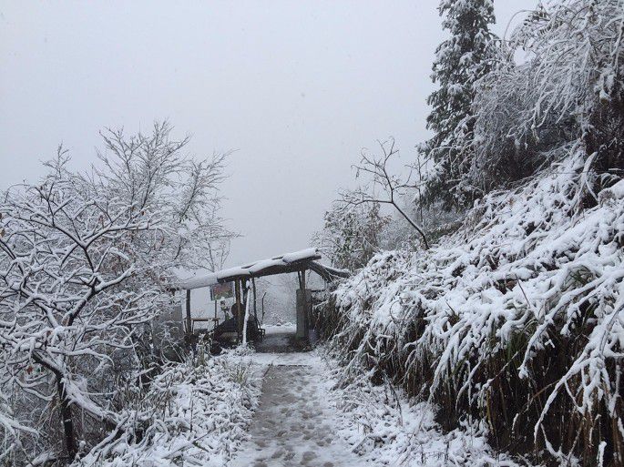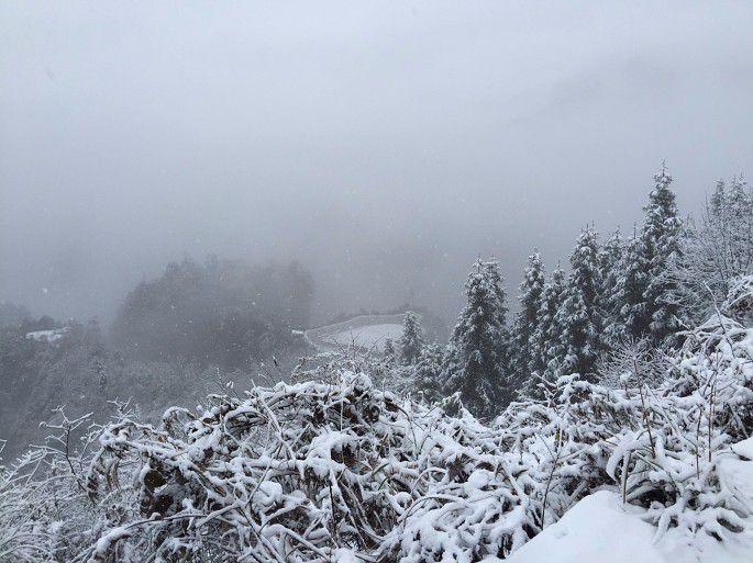 我们去的时候,天空正飘着雪花,能见度不高,站在上面根本看不清远处的田园风光,往下走一段路应该是可以看到田园的,不过雪地覆盖的台阶很滑,我们也没穿雪地靴,只是一双单薄的运动鞋,所以不敢往下走,又是一个小遗憾了。
