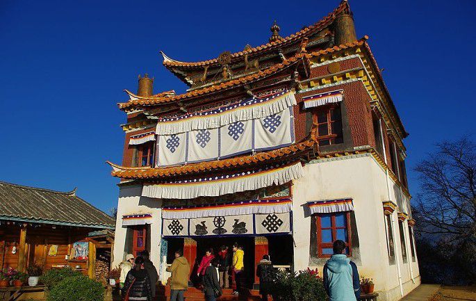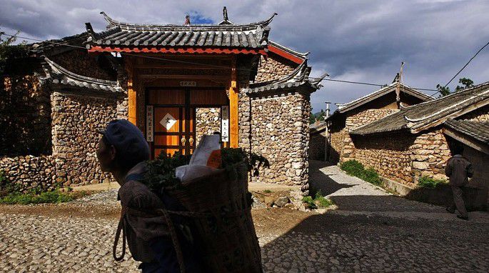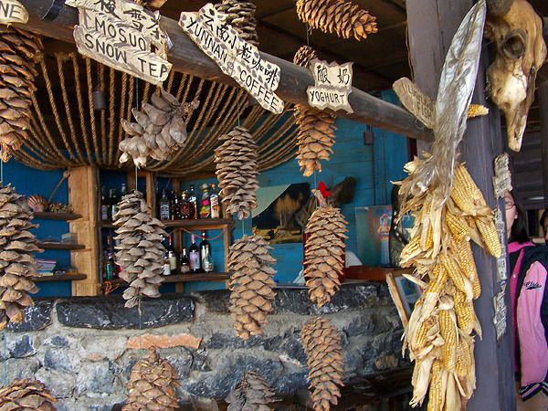 从丽江到泸沽湖,沿途尽是大气磅礴、绵延不绝的山,有的山顶上,还有常年不化的积雪。天瓦蓝瓦蓝的,总有云彩在飘。山地贫瘠,且少水,居民多种玉米、荞麦。就是不成片的田头地角,山民也会不失时机地栽上一两棵南瓜藤。民居或为干打垒的土屋,或为半圆形的木板钉成的木屋。很多人家的屋檐下,挂着许多的玉米,堆着许多南瓜。这几乎成了沿途的一道风景线。