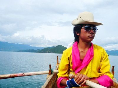 车到宁蒗县城,上来一个头戴宽边呢帽,身穿金边大襟衣,脚着长统皮靴,腰挂佩刀的摩梭小伙子。他是我们泸沽湖之旅的导游小杨。