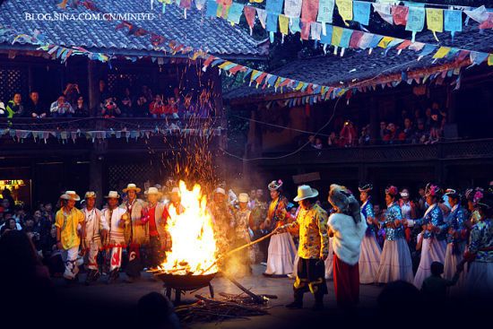 晚饭后,我们来到民族村参加篝火晚会。只见一个四方形的露天舞台,中间燃起一堆篝火。一会儿,来了一大队少男少女,手拉手站成一圈,在领队悠扬的竹笛声中,跳起了甲搓舞。甲搓舞,舞姿粗狂,节奏明快,跳着跳着,游客也被感染了,跑进圈内,与之共舞。