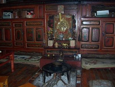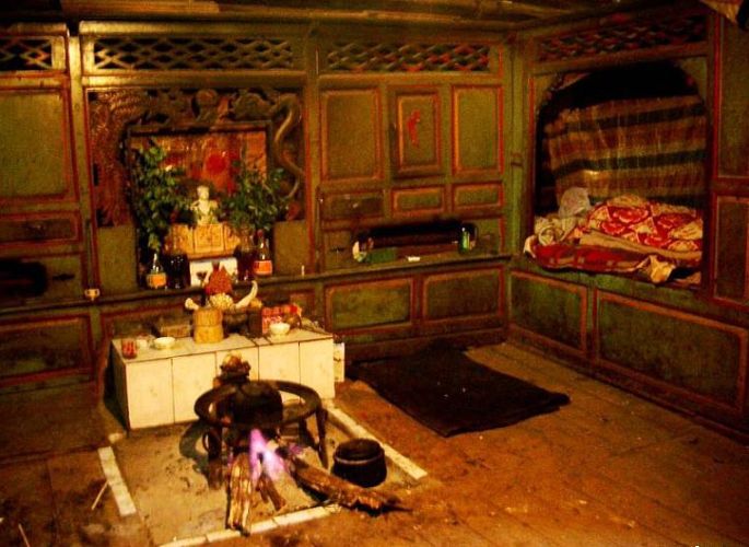 正房也叫祖母屋,用来供养家族中最有权威的女性,也是家族集体活动的场所,是议事、炊事、祭祀的地方。房中靠墙的地面中央,有一个正方形的火塘。据说,火塘是摩梭家屋最神圣的地方,是祖母屋的心脏,摩梭人的火塘是终年不熄的,代表家族生命延绵不尽。