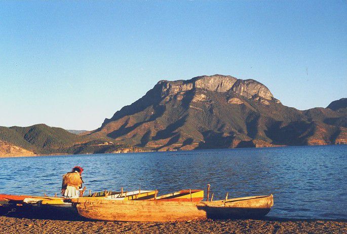 下午3点,到泸沽湖。湖水湛蓝,山岛竦峙。湖边停泊着许多独木舟,名曰猪槽船。船上,有一妇人掌舵,两个男孩划桨。他们都穿着颜色鲜艳的盛装,在这样的蓝天白云,青山绿水中,显的特别的醒目。
