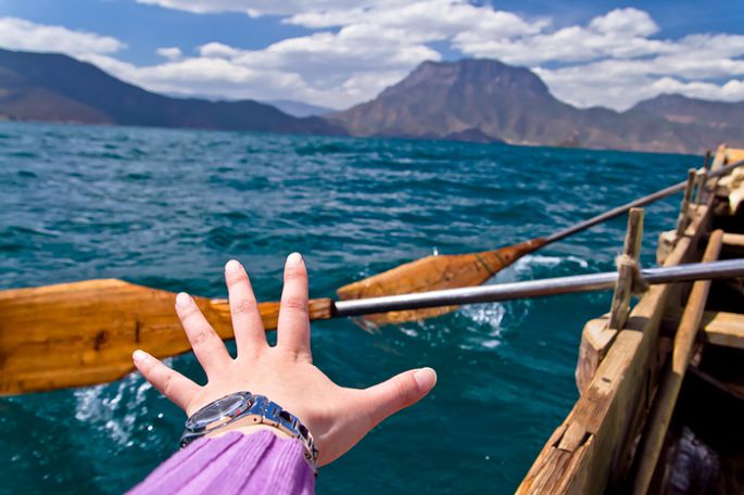 泸沽湖烟波百里,北岸,竟是四川盐源县。在我们的要求下,摩梭小伙把船绕岛一匝,到了四川的水域,再回岛上的。