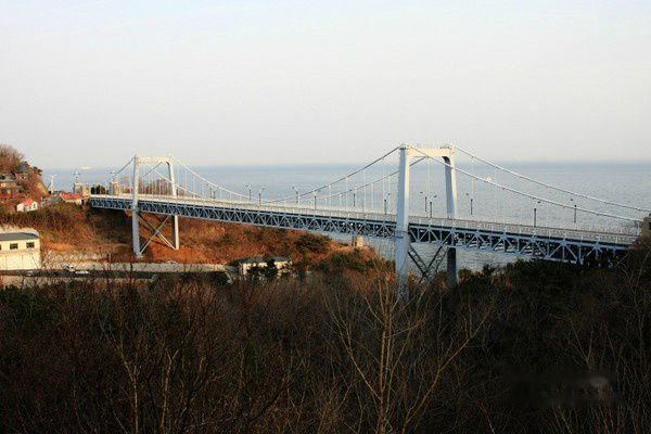 北大桥位于大连海滨风景区中的老虎滩景区与燕窝岭景区之间,是一座近海临山横跨山谷的旱桥。它是贯穿整个大连海滨风景区东西滨海路的要冲,而且也是老虎滩景区西部和邻近的燕窝岭景区中一壮观秀丽的风景点。 该桥为三跨简支加劲桁架悬索桥,全长230米,中跨跨径132米,桥宽12米,其中车行道宽为8米。主索失高13.2米,失跨比1:10。