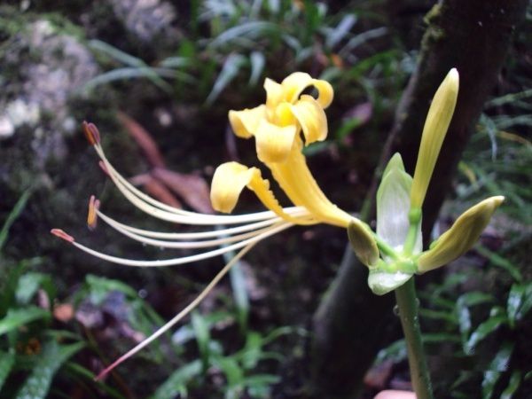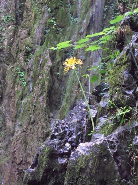 山中野花繁多,唯有一种花冠硕大的黄花最奇特。只见一茎一花,不见有叶。花瓣翻卷,长蕊如丝。细看方知乃数朵环聚而成。(注:经查证,此花名为彼岸花,因其花、叶永生不得相见,即佛经所云曼珠沙华是也。)