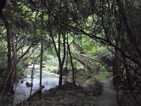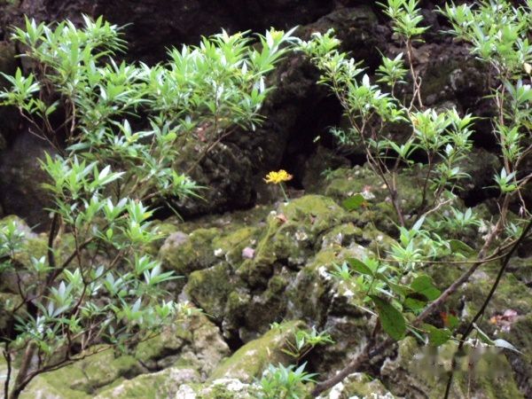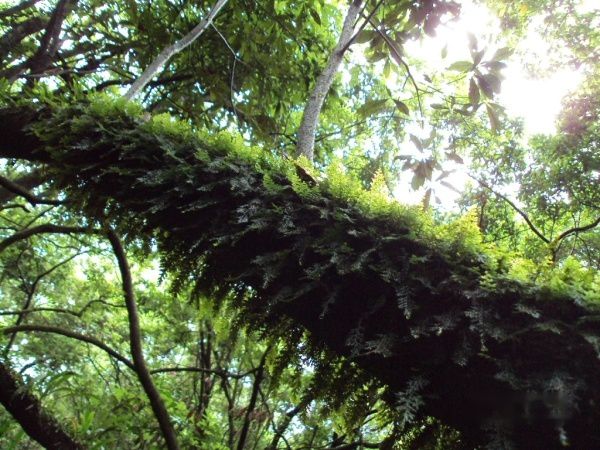 出了飞云洞,就是漏斗原始森林了,前面已经没有了铺好的路,只一条似有似无的小路,仅容一人且滑湿不堪,数次险些滑倒,不禁惊叫连连。谷中蚊子又大又多,荆棘中蛛丝缠绕,两手不停地挥舞,初时兴致颇高,笑谈这就是徒步穿越的乐趣,后来又心焦不已。算算已过去1个小时,前路似乎无穷无尽,不禁猜测是否走错路了?可是似乎并没有看到岔道,且若是不通,观光车的司机会告诉我们的吧?一边互相安慰一边鼓劲前行。