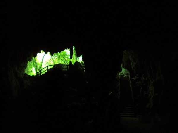 一路向上,远远望见一洞口。果然飞云洞到了。有警告牌曰:因山洪毁坏尚有未修复处,望原谅。洞内漆黑一片,伸手不见五指。幸好有一个手动的小手电,二人携手,手扶栏杆,每走一步先伸足探深浅,借着微弱一点光线缓慢前行。既盼着早一刻走出黑洞,又不敢迈大步前行,真是前所未有的经历。