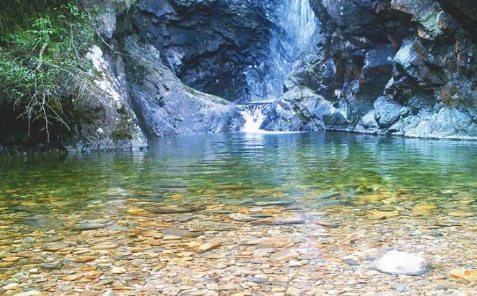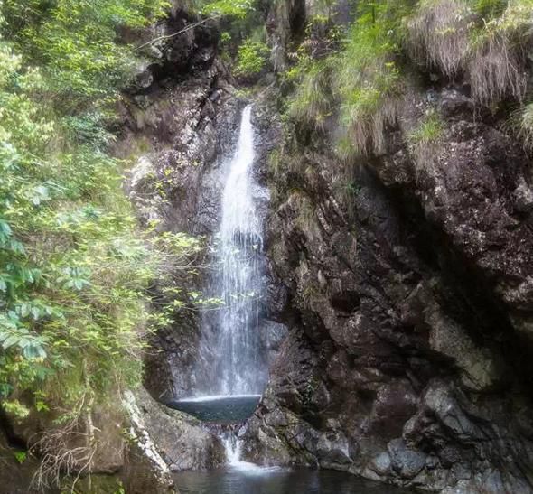 两旁林木茂盛,浓荫蔽日,行走在蜿蜒古径,仿佛穿梭于时光隧道,小河清澈见底,河内怪石嶙峋,置身与山水之间此刻已分不清是我们融入了自然还是自然吸纳了我们。一直往前走,穿过一个长廊,还有一个龙母庙,我们因为对这些不太了解也就没有走过去胡乱许愿,就能看到细长的瀑布——柳姑潭瀑布,瀑布如白练至上而下缓缓流洒,像极了一位娴静的女子悠悠地从山顶漫步而下。而这流淌着的无尽的涓涓细流似那母亲的谆谆耳语,诉尽了历经大浪、风雨后归于宁静的成熟女性的柔美心声。
