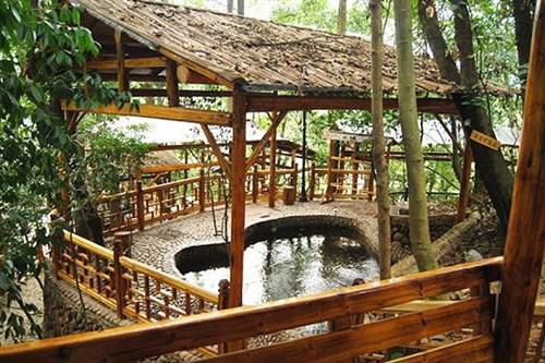 走进温泉,即进入了“森林浴”,园区建在诗情画意的金山山坡上,整个山坡覆盖着150年树龄的阔叶林,这里古木参天,绿荫如盖,云蒸霞蔚,四季如春。后有百亩茶园生机葱茏,前为弓月清溪终日流淌,对面更有百亩森林起伏连绵,园中从道路到建筑,所有材料一概取自天然卵石和原生木材,利用山林的空隙建筑水池,使其与森林组成和谐的生态环境。