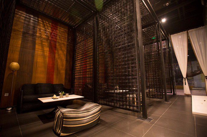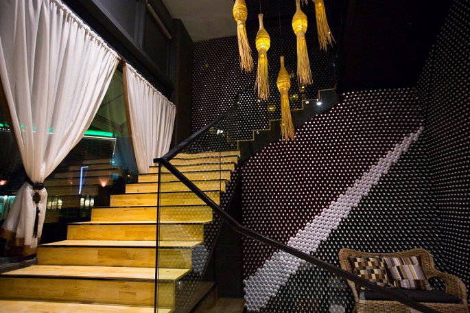 有质感的白色帷幔垂坠,有东南亚风情的饰品点缀,整个楼梯间都是用他们产品的瓶子排列的,很有视觉感,话说这是用过的还是新瓶子咧?