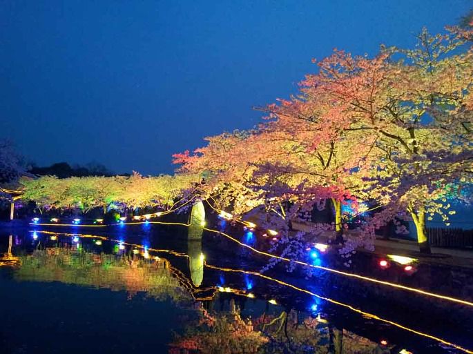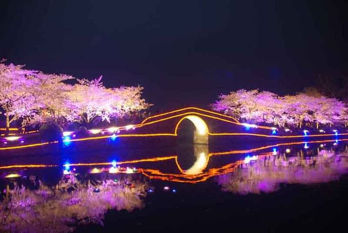 鼋头渚夜景,樱花在灯光的映衬下更加朦胧,诗意。