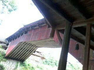 仰看薛宅桥可以看到桥的结构为编梁木拱,竖的拱骨搭在横的龙头上,长的拱骨并列9根有三组呈八字形。