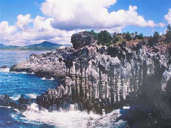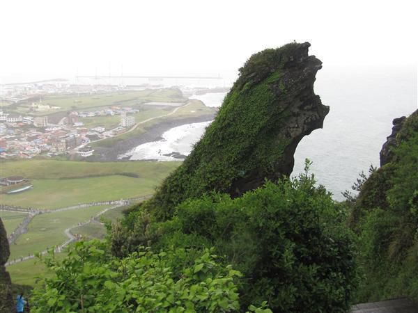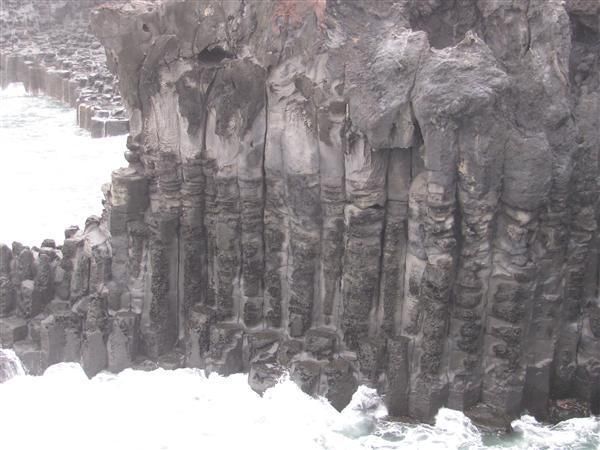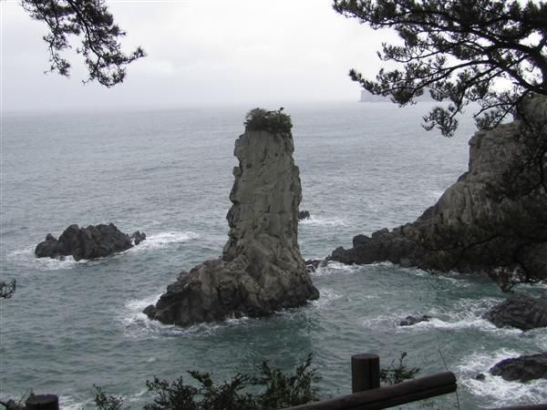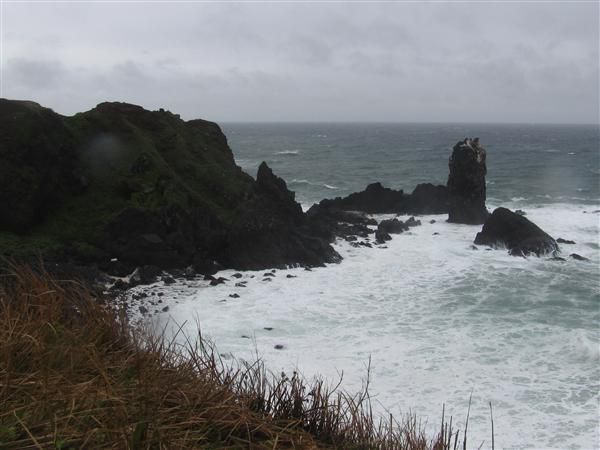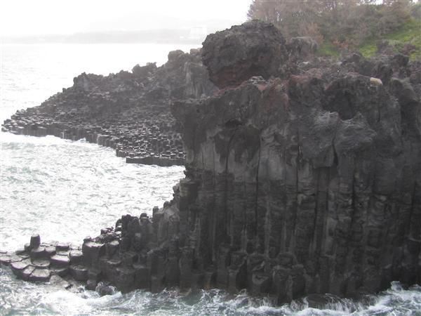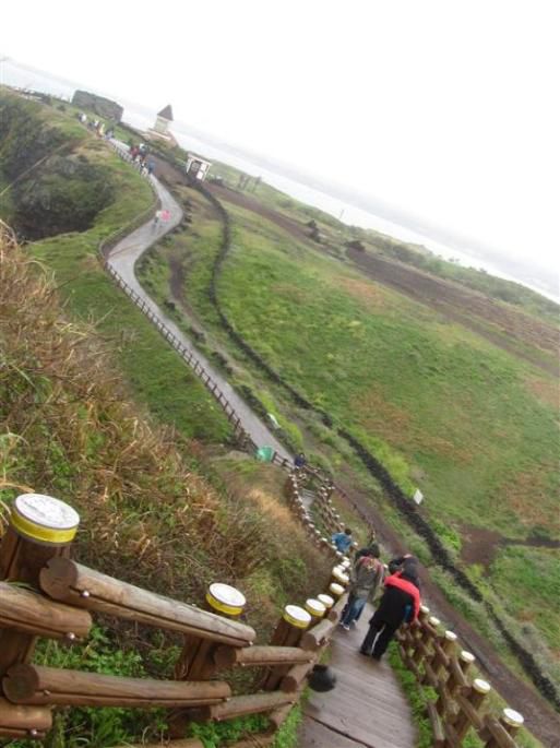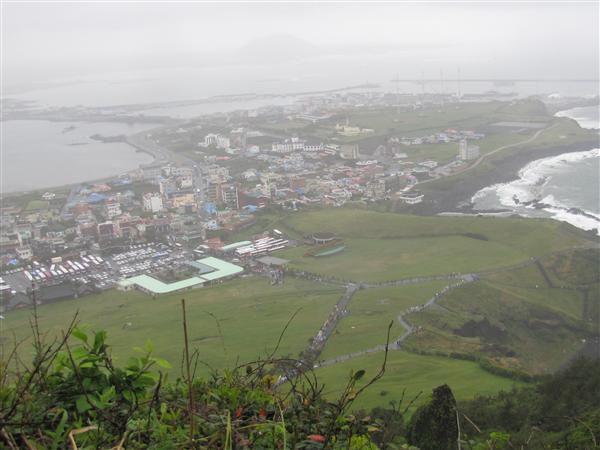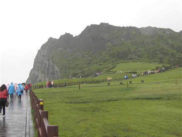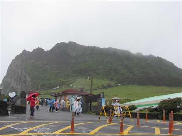 因为下雨我们求助酒店前台 帮助找车,但是便宜的出租车都被定走了,出于节省考虑,我们决定乘公共巴士,但是等车时被开出租车的大叔搭讪,最后我们两个人决定包一天的车8-5点10 万,因为我们只有两个人,最后讨价还价这个价格成交,实际证明我们的决策是英明正确的,因为下雨如果乘公交车,还要换车找车,看不了几个景点,实际上因为 我们的决策参观了涉地岬-〉城山日出峰-〉城邑民俗村-〉正房瀑布-〉独立岩-〉中文柱状节理带