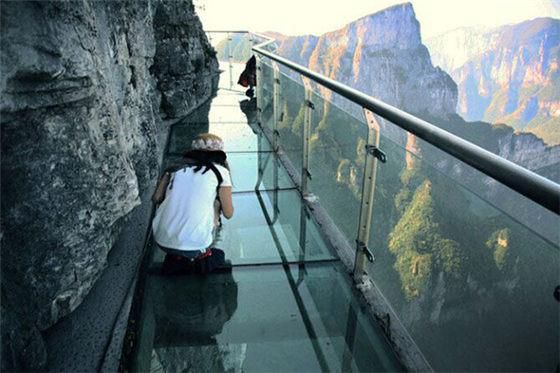 接踵而来的就是有着东方“天空之路”美誉的【玻璃栈道】,站在玻璃上,俯瞰脚下的悬崖峭壁,山川白云,着实让人腿软,生怕在某一刻玻璃碎了坠下山崖。害怕的同时,又着急着去将这里的美景收揽于心,生怕自己错过了某一个惊艳的画面。蓝天和白云的倒影铺满了整条栈道,在对脚下的透明战战兢兢之余,更乐享于踏云而行的快感。