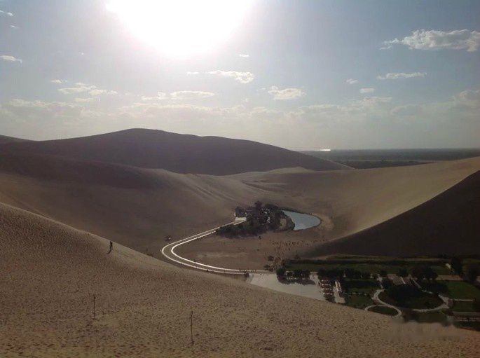 去鸣沙山月牙泉要么是看日出要么是看日落。来敦煌的这几天晚上都是晚上12点钟才到达青旅,过着晨昏颠倒的日子。上午在青旅补瞌睡,下午5点之后太阳稍微不那么炙热的才出门。坐3路公交车大约15分钟到达鸣沙山月牙泉。门口有微信扫二维码关注敦煌旅游,免费得到杏皮水一杯。鸣沙山因大风吹过沙子发出鸣声而得名,金黄色的沙粒细如粉末,沙丘连绵起伏,一座连着一座。顺着沙丘向上爬,沙子很软,晒了一天很高温度,要租鞋套。风卷起沙子时往眼睛、嘴巴里灌,必须带上墨镜和口罩或者围巾。月牙泉如同一弯新月,泉水已经干了,今天的月牙泉是人工蓄水。晚上八点多大批游客来了,大都是从莫高窟来的。沙尘暴也来了,黄沙弥漫空中,吹得人无法睁开眼睛。