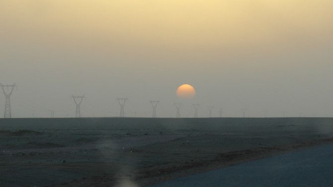 在临河下高速,就进入了213省道,此路可以一直到达额济纳旗。过了杭锦后旗,沿狼山西行,不远就进入了沙漠、戈壁,基本上在巴丹吉林沙漠北部穿行。公路沿途两侧基本没有人烟,路两边就是一眼望不到边的戈壁,地面零星地生长着骆驼蒿,道不尽的苍凉、雄浑。在路边不时地碰到三五成群的野骆驼(当时为了赶路,没有拍照,本想回来再拍,可回来时就没有见到,悔之晚矣,这才体会到了啥叫时不再来)。要到额济纳时,已尽傍晚,有幸看到了大漠日落,领略了“大漠孤烟直,长河落日圆”的壮美。