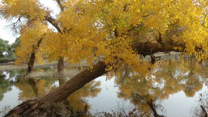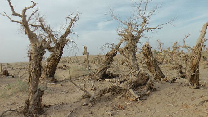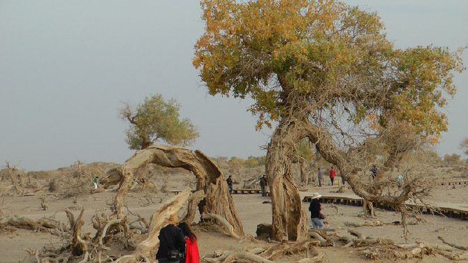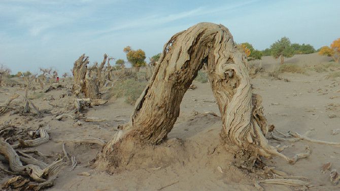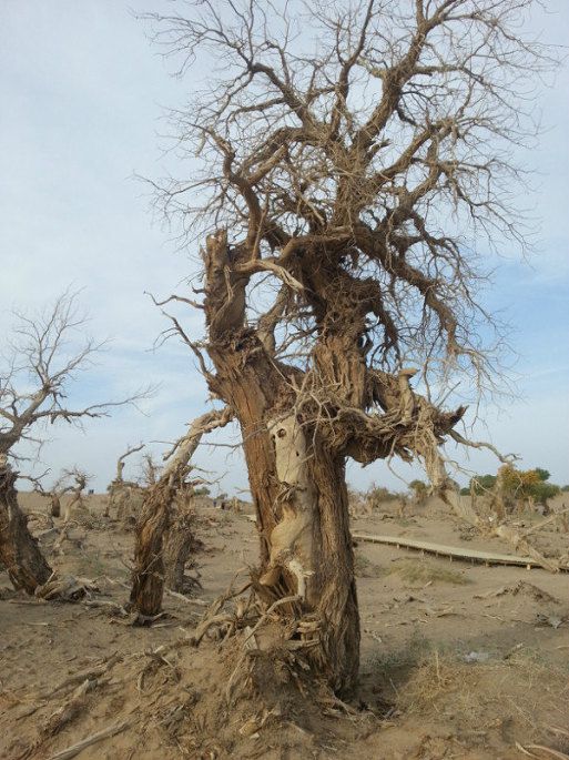 胡杨树干有很多形态,弯转扭曲,摇曳多姿,树干苍劲,面目狰狞。本人推断其形成原因可能是本地风较大,在树生长初期,树干被风吹折、吹斜,但胡杨生命力强,继续生长,所以长成千奇百怪形态。一已之见,不知对否。