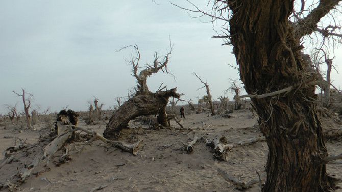 怪树林位于黑城西南边的荒漠中,这里曾是一片茂密的胡杨林,由于河水改道,水源断绝造成树木大面积枯死。因枯木形态各异、奇形怪状而得名“怪树林”。这片枯树林仿佛在向世人诉说着对生命之水的强烈渴望,体现了它们与恶劣自然环境顽强抗争的不屈精神。怪树林里枯死的胡杨“陈尸”遍野,呈现出古老的原始风貌。冥冥之中,渗透出一股狰狞恐怖的气氛,令人毛骨悚然,充满神秘色彩。