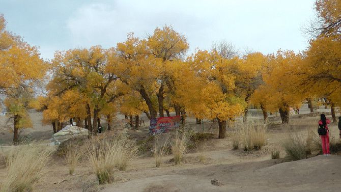 由于时间紧迫,看完黑城、怪树林,直奔胡杨林景区。“胡杨生而千年不死,死而千年不倒,倒而千年不朽”,又称英雄树。额济纳胡杨林区39万亩,是世界仅存三处之一(其他两处新疆塔克拉玛干沙漠边缘 和非洲撒哈拉沙漠边缘),且保护最为完整,最为美丽,最为壮观。胡杨是生长在沙漠的唯一乔木树种,且十分珍贵,可以和有“植物活化石”之称的银杏树相提并论。胡杨风景被列入中国十大奇妙勾魂风景之一。十月初开始,树叶经霜开始变成金黄色,树干龙飞凤舞,千姿百态,枝叶摇曳,金光闪烁,在蓝天白云下,流金异彩,十分壮观。
