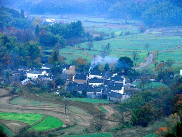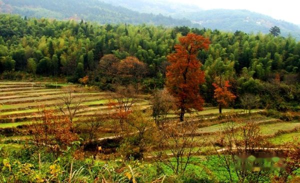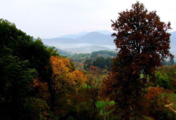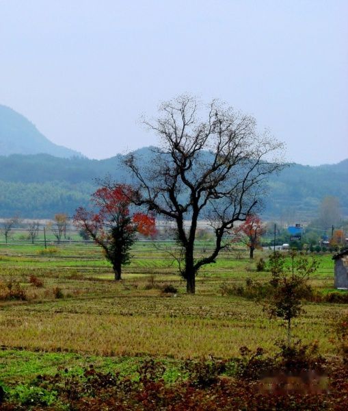 田里绿油油的种的是大片的萝卜,收割后的稻子,稻茬还杵在田地里,成片的桑树摆着他奇特的造型。远看一掉光叶子的木梓树,近看树上结满的白色的果子,像一团雾,又像一片云,很有另一番味道,而最著名的玉树参天在一路上多次出现,路过的村庄溪绕前屋,村后山坡竹山莺啼,对我们长期生活在城里的人来说,真是美得享受。