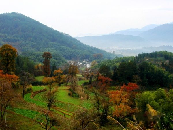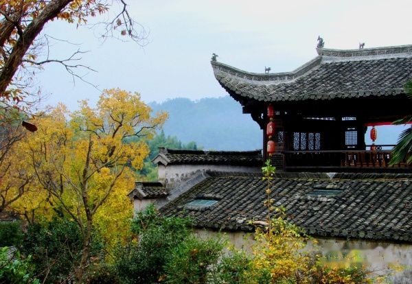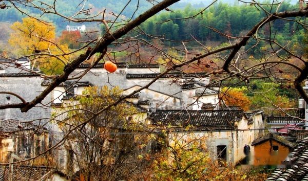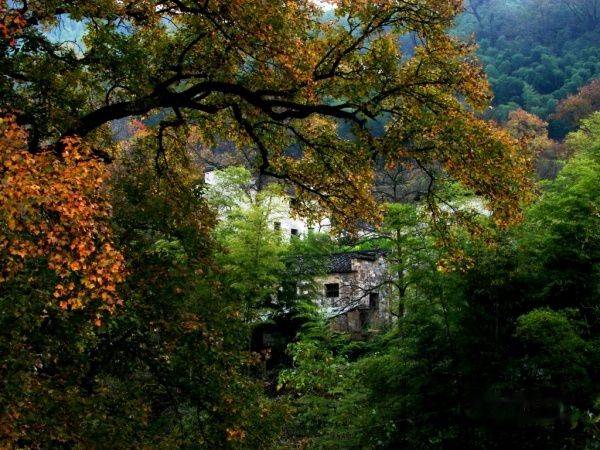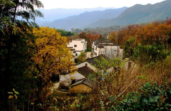 公路的右边是山坡,红叶后面隐掩的徽派民居如世外桃源,红枫丛中忽露出飞檐翘角,粉墙黛瓦在金黄叶子的掩映下,就如中国山水画般诗情画意,让人感叹:住在这里的都是仙啊!