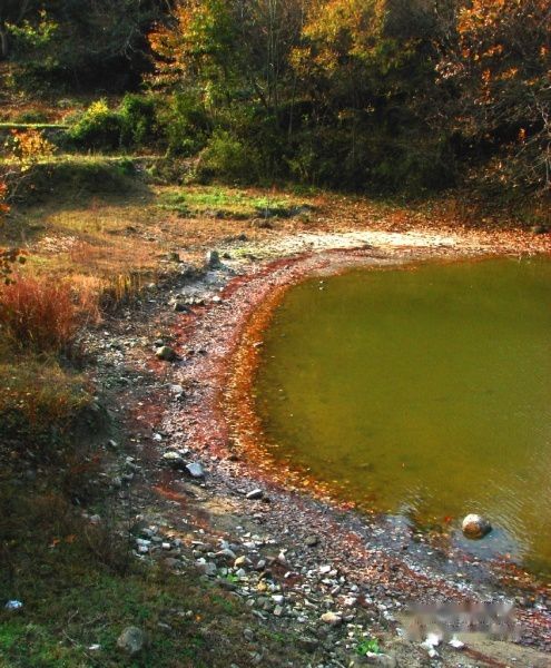 主人姓吴,听说我们要到协里,主动要带路,费用20元,也好,因为要翻过一道山梁,有人带路会更顺利,还有,我们就是要走小路,这样会看到别人看不到的风景,事实证明我们的选择是对的有这几张照片为证。这里有神奇的小池塘,塘水清清的,塘边却镶着一道彩色的边,其实,这是树上的红叶落入水中后,再被推向岸边,而染下的颜色。