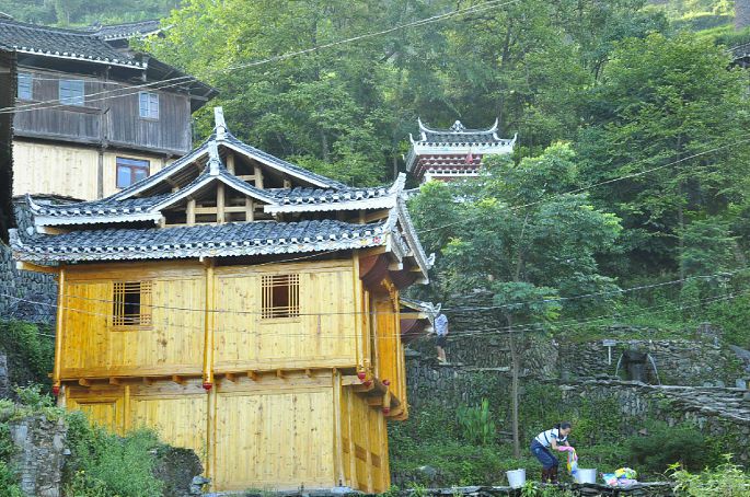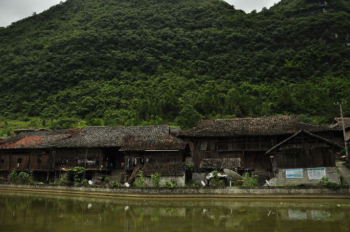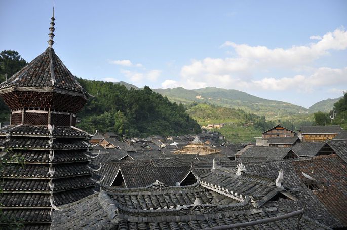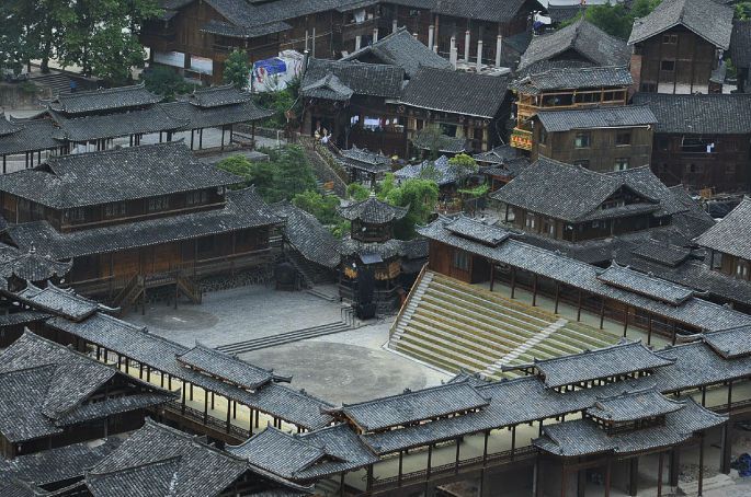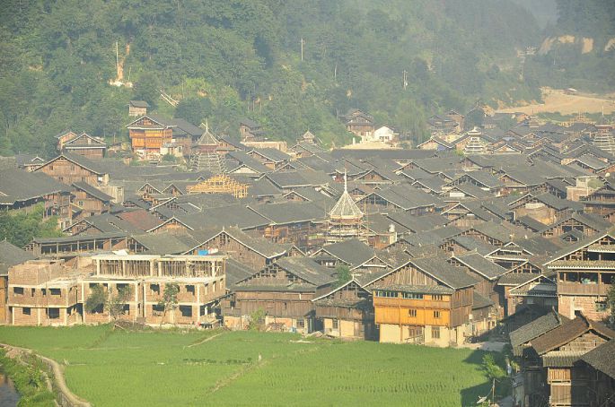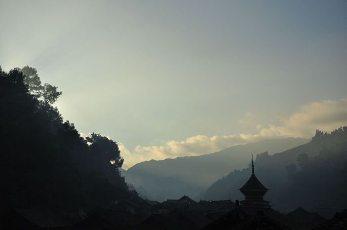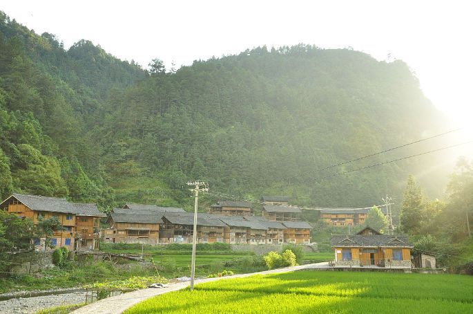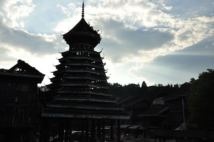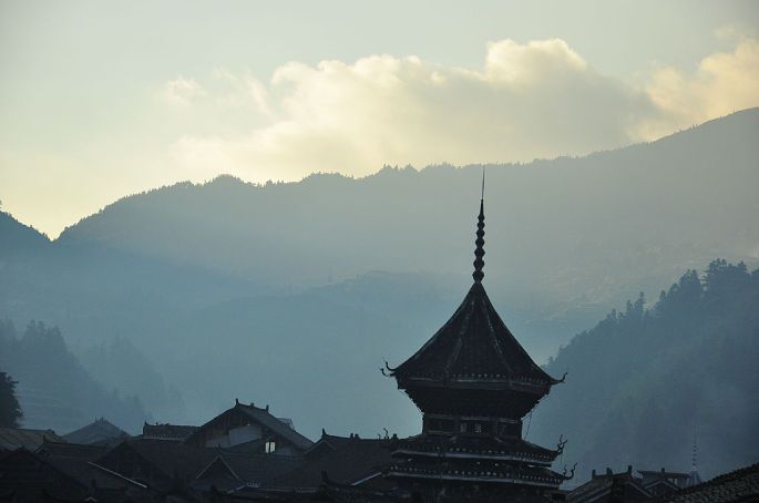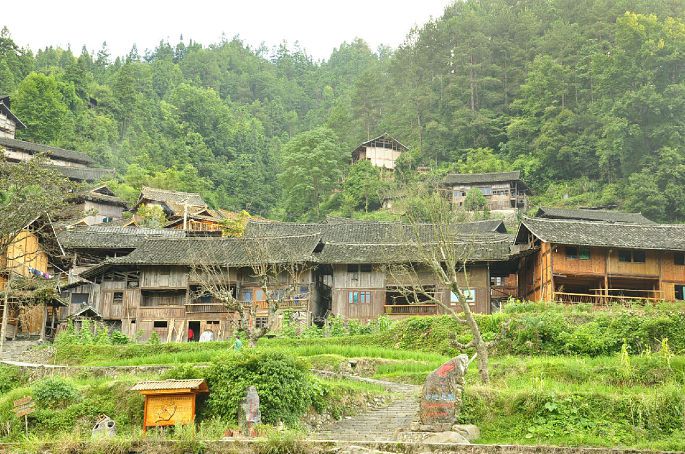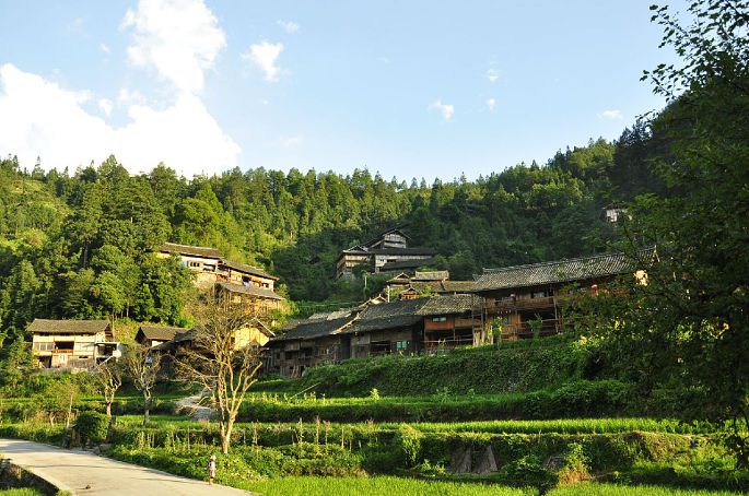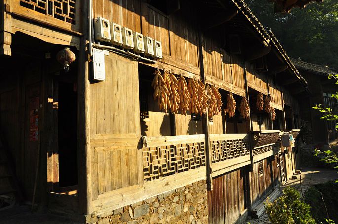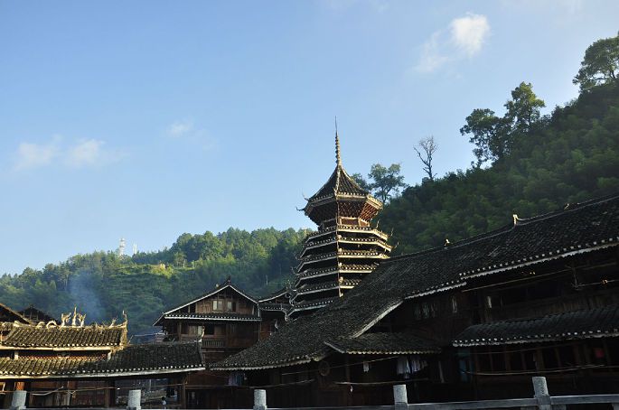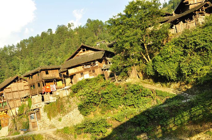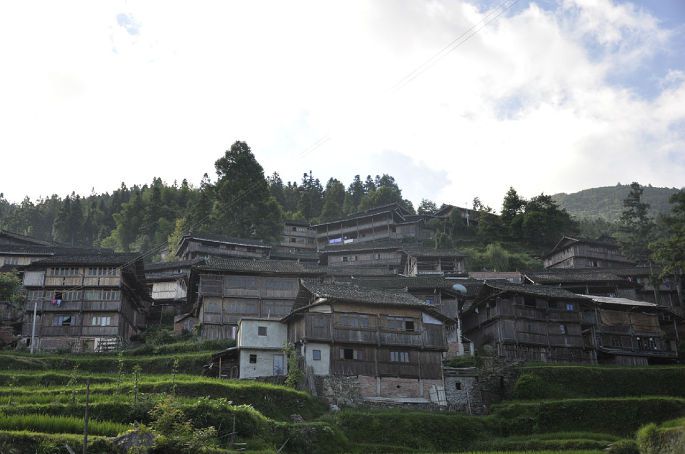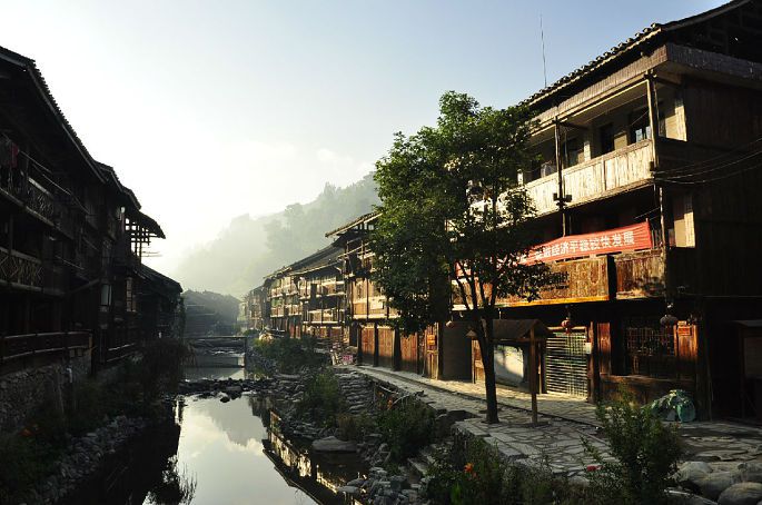 肇兴侗寨四面环山,寨子建于山中盆地,两条小溪汇成一条小河穿寨而过。寨中房屋为干栏式吊脚楼,鳞次栉比,错落有致,全部用杉木建造,硬山顶覆小青瓦,古朴实用。在晨光的照耀下,远远望去古朴而安详,无不让人心动。
