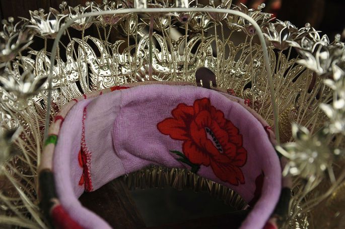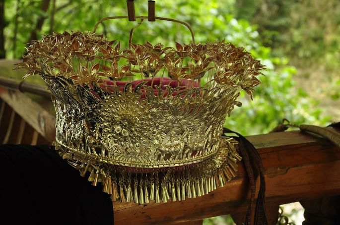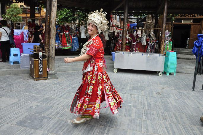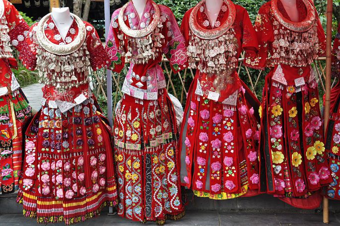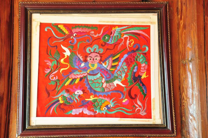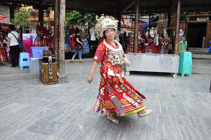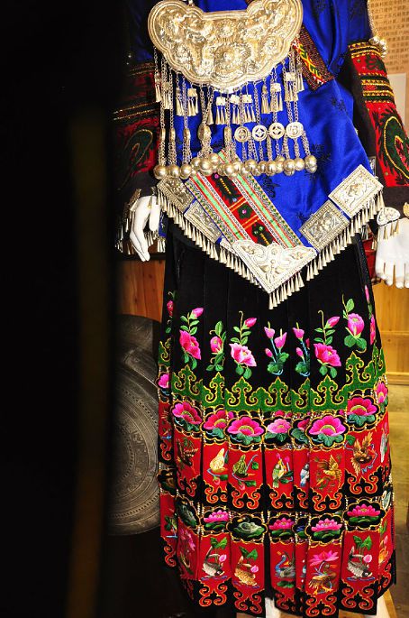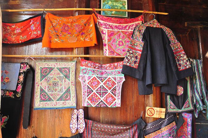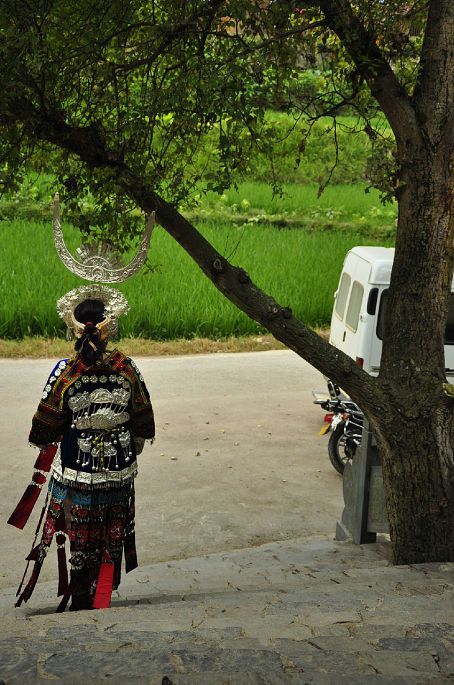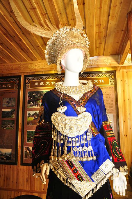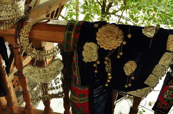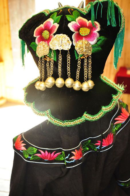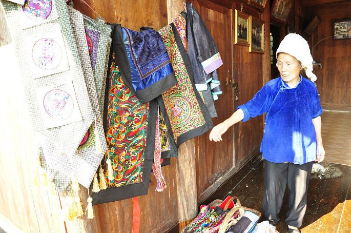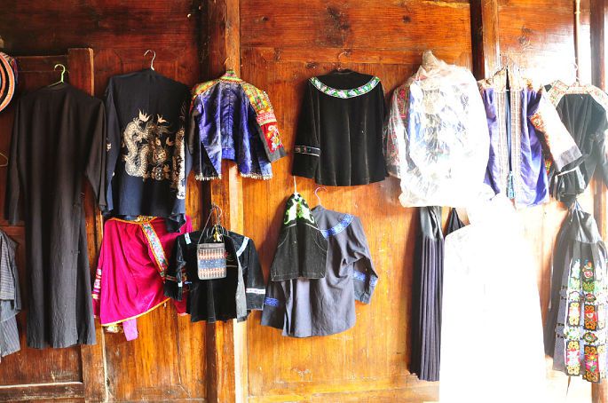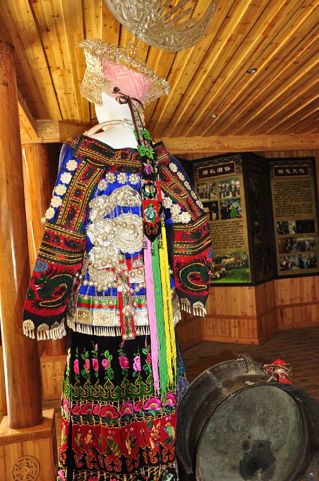 这衣服好重,试了试足有几斤重,所有的花都是手工绣上去的,再加上苗银,村支书老伴跟我说,通常这样一件衣服要绣上一年至三年的功夫或更久!