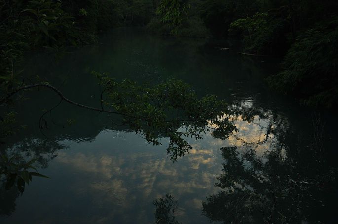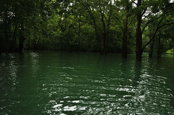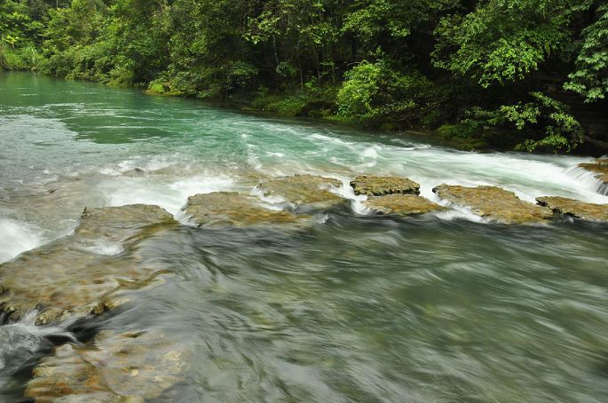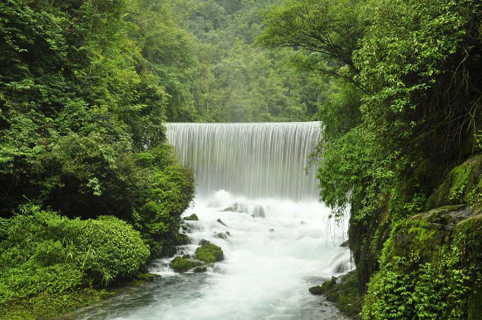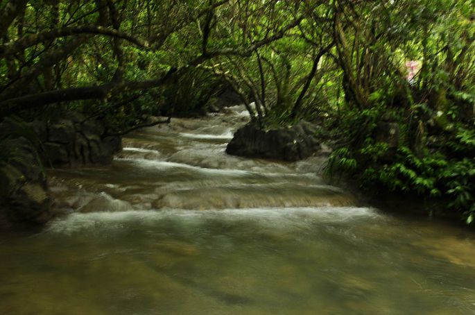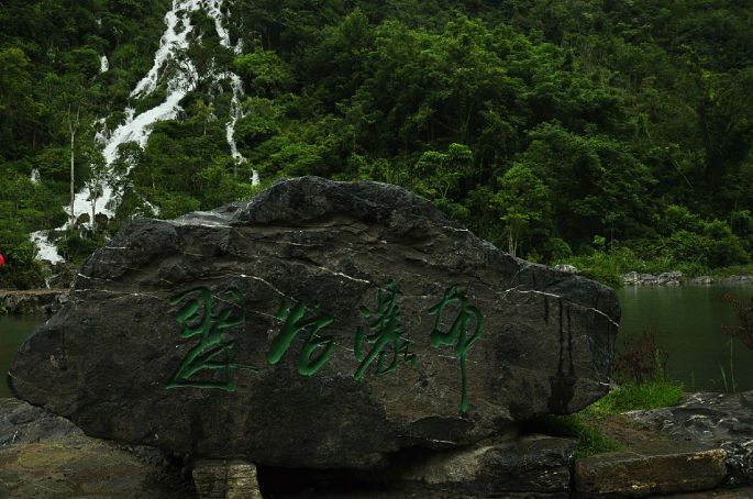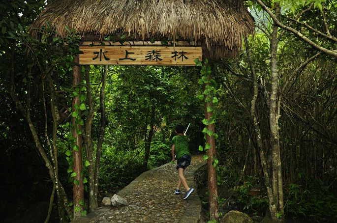 水上森林==是一片极其独特的森林。仔细看去,这里的千百株树木,全都植根于水中的顽石上,又透过顽石扎根于水底的河床。水中有石,石上有树,树植水中,这种水、石、树相偎相依的奇景令人叹为观止。一对浮出水面的荷叶喜迎一支水蜻蜓的来访!
