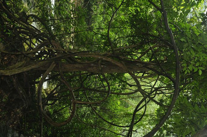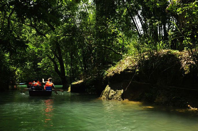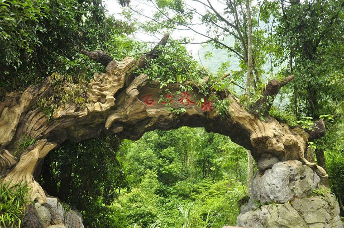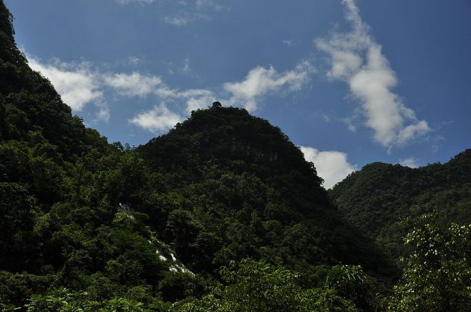 河的南侧群山起伏的原始森林中 ,生长着一种龟背竹,龟背山由此得名。林内曲折难行,山中许多形怪状异的树木根系都顽强地生长在岩石峭壁的裂隙之中,一派原始野趣。山里物种之丰富,令人惊叹,其中不乏珍贵的树种、菌类,栖息在这里的上百种鸟类中,就有十多种国家保护的珍禽,堪称一座罕见的生物基因库。 与龟背山相连的野猪林,人迹罕至,林木遮荫蔽日,实为清凉世界。林中藤缠树树,树缠藤,是迄今发现的全国最大的野藤景观,其间石包木 、木包石,令人叹为观止