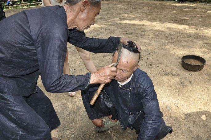 芭莎苗寨民居、头饰与其他村寨迥然不同,独具特色,古代文明和现代文明并存,现在仍然保持着鲜为人知的镰刀剃头、古代发式,简约婚俗,特异葬礼,它能让人穿越时间隧道,看到两千年来的社会发展轨迹;看那刀不咱的但估计也是熟能生巧需要把握有度吧!