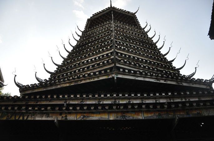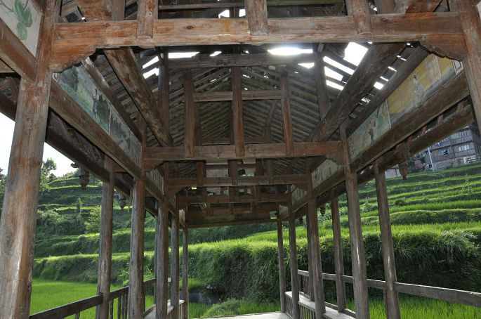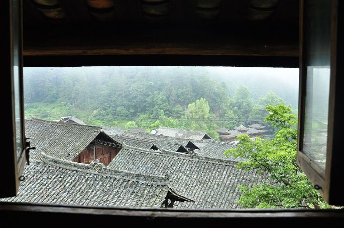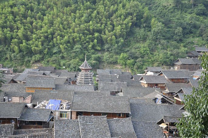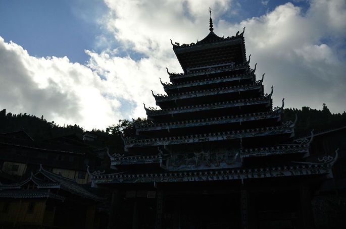 侗寨建鼓楼是吉祥的象征,兴旺的标志,由全寨人集资修建。鼓楼的作用有:一是侗寨的标志。二是侗族族姓的标志。三是侗族群众休闲的场所。四是年轻人社交的场合。五是接待客人的地方。六是集会议事的要地。七是传递信息或报警的工具。八、祭祀的地方,每年正月初八踩堂祭萨。青年旅馆的老板娘让我不要跑去对面山上小学那边看全景了,上她们家的楼顶也可以观景,早上5点多扶着小小的铁梯小心翼翼地爬了上去,呵呵确实别样!