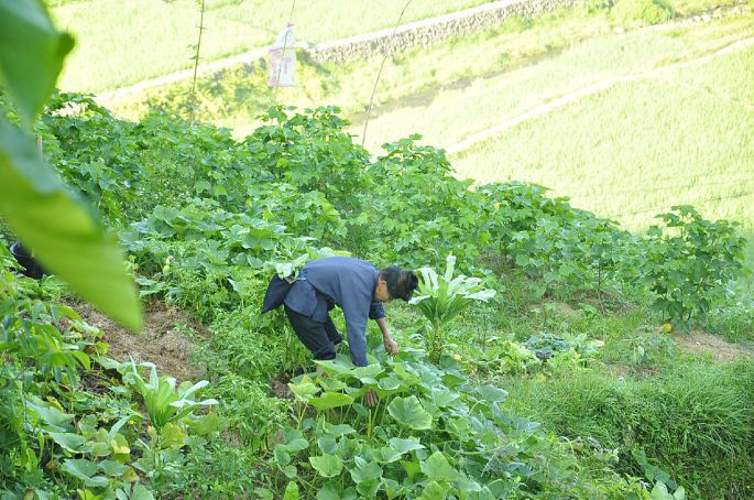 去堂安的路上,山坡上的这位阿婆早早地下到地里了