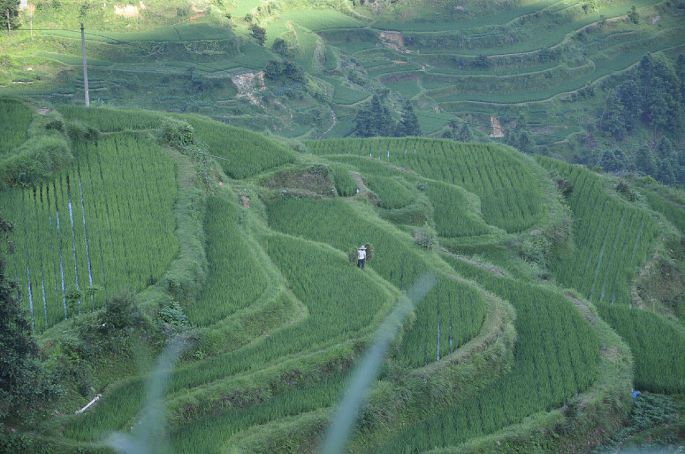 一路看见壮观的梯田层层叠叠,绿色的田埂象画框一样勾勒出梯田的轮廓,在初升的阳光下煞是好看,一切都显得那么静谧。