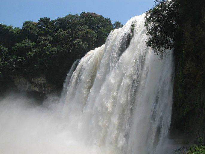 黄果树瀑布是世界上唯一可以从上、下、左、右、前、后多角度观赏的瀑布,尤其是这个后——从里向外看。小心地走在湿淋淋的洞内,不时有水滴落到头顶身上。透过朝外的洞窗,可以清晰的看到疾坠的瀑流和对面山腰上行进着的彩色人流。而那远望壮伟无比的瀑流,此时此地,却几乎可以用手触摸到呢。