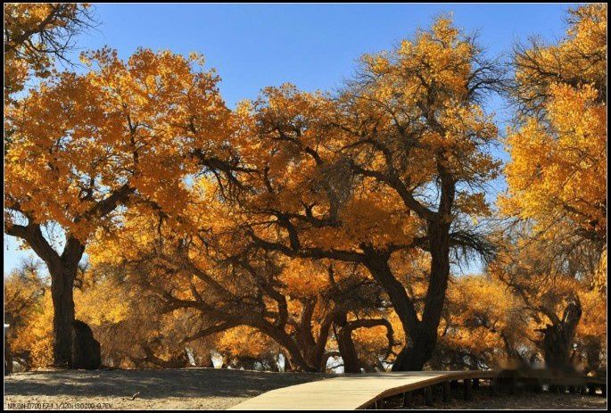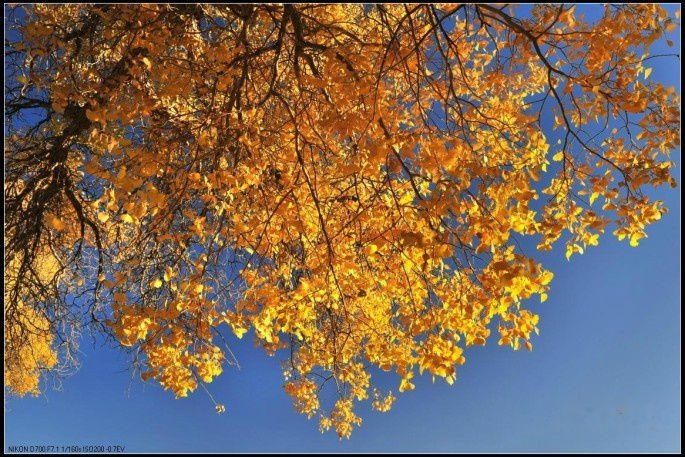 中午吃了带去的干粮,继续在景区中拍摄、游玩。不见大漠,不知天地之广阔;不见胡杨,不知生命之辉煌。下午出了二道桥,又去了四道桥,一进景区,满目金黄。密密麻麻的树群比二道桥来的浓密茂盛,在午后的阳光下,胡杨叶泛着晶莹通透的金光,这颜色透明、夺目,又如此奢华无忌,让一切语言在她面前都显得苍白无力。
