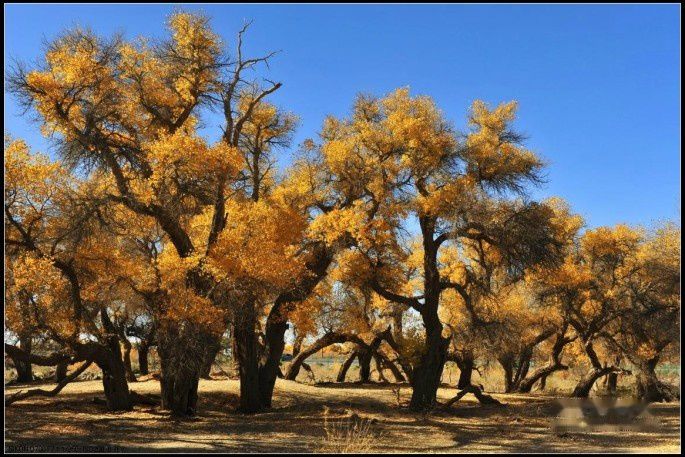 额济纳以胡杨林著称,世界上三大胡杨林之一。这是一个神奇的树种,她的生长总是和凤凰与鲜血紧密相连……这是一个多变的树种,春夏为绿色,深秋为黄色,冬天为红色……这是一个坚强的树种,活着千年不死、死后千年不倒、倒后千年不朽……弱水河畔、居延海边是胡杨的故乡,这里的39万亩胡杨林是当今世界仅存的三处天然河道胡杨林之一。额济纳旗旗府四周有大片的胡杨林,往东总共有八道桥,每道桥都有胡杨环抱。金秋,胡杨干脆利落地褪去绿意,换上的,是纯粹的金黄。