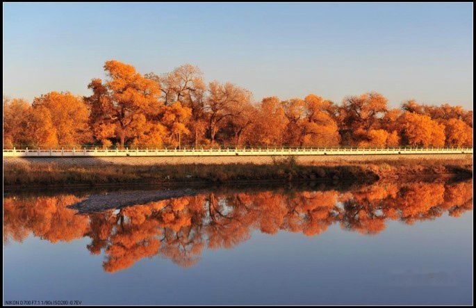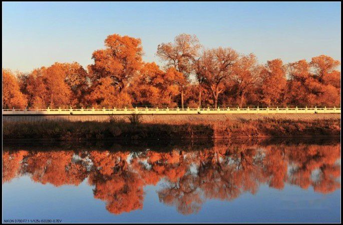 一直到太阳西下,才离开胡杨林,路过一道桥,这是座修好的大桥,河边都有护栏。这时夕阳打在岸边的胡杨林上,倒映在河中。