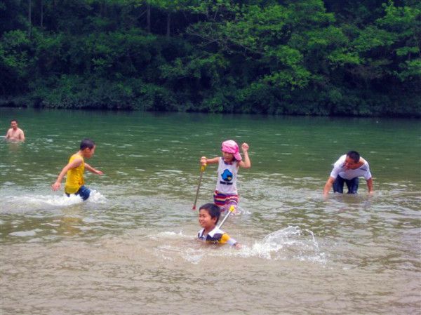终点码头就在将军岩下,这里有一片大面积的浅滩,女儿和一众小伙伴们,一头扎到水里,很是过瘾的样子,我们几个大男人也经不住河水清凉,和孩子们尽情玩水、嬉戏去了,只有同行的一个文静的小女孩,立在岸边拉着她妈妈的手惊叹一声“妈,你看,他们都疯了”,终于也加入了我们。南山、崀山的行程即将结束,没曾想大人、小孩竟然以这样的方式作别了,或许这样的欢快、忘我才是我们真正想要的。
