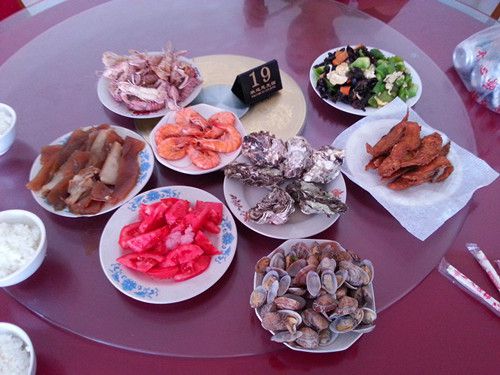 下图:这是第一天的晚餐,很丰富吧,中间的牡蛎,会吃,却不会怎么打开,后来叫服务员帮忙的打开的。