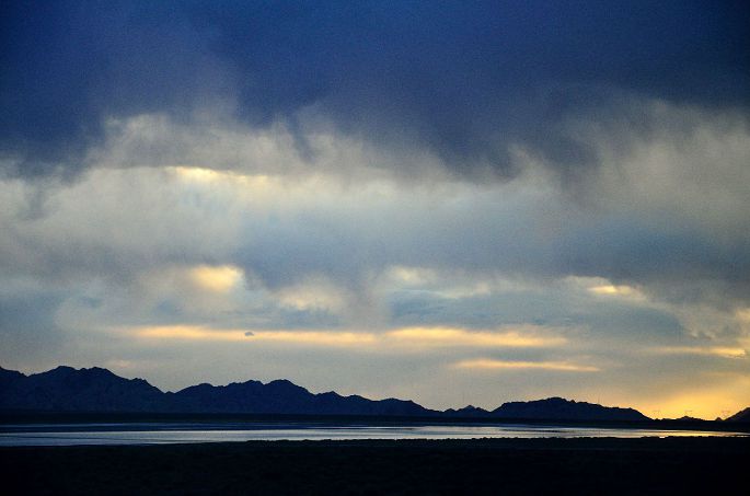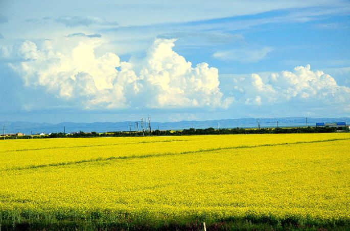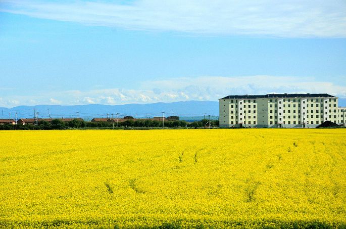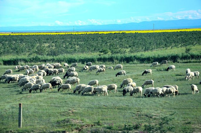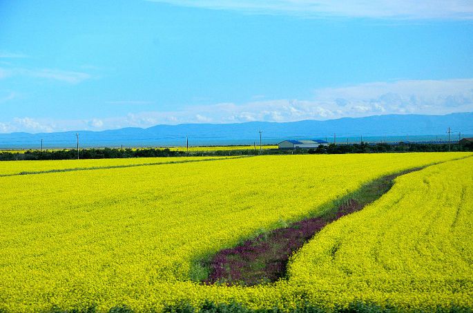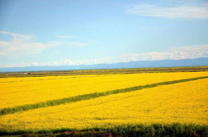 DAY2:傍晚时分,列车行驶至青海湖畔,成片的菜花和壮观的晚霞。