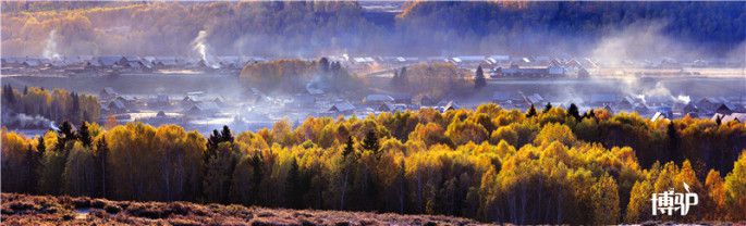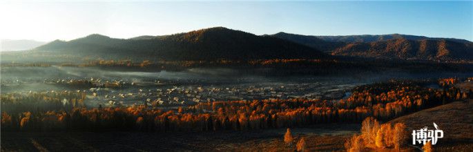 禾木村的远景,禾木村是在四周山谷中地势较为平缓的一块地方,可以看见村庄周围都是成片的高大白桦林。秋天那漫山遍野的白桦林都被染成了金黄色,与沐浴在阳光下的村落同色,显得美丽又悠远。