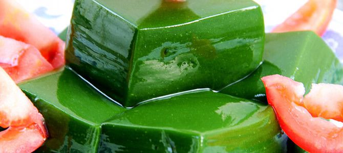 乡间农妇常在劳作回家途中,连枝带叶信手撅回一束,摘下叶片洗净,放在盆中用手揉成糊浆,倒入铺上几层干净棕片的筲箕之中过滤,点入澄清了的适量草木灰水搅匀,片刻,便神奇般地成了一盆颤摇摇、绿幽幽的“豆腐”。而后,用菜刀横竖划成方块,浸入挑来的冰凉的山泉水里,待作上一碗拌有蒜泥、辣椒和其它佐料的蘸水,用漏瓢捞上一碗,就可以一块一块地蘸着吃了;也可以盛上一碗,淋上蘸水,用小匙舀着吃。神豆腐细嫩,晶莹如玛瑙,带着斑鸠柞树叶特有的清香,吃起来煞是可口,可与粮食作成的凉粉媲美。(来自搜狗百科)