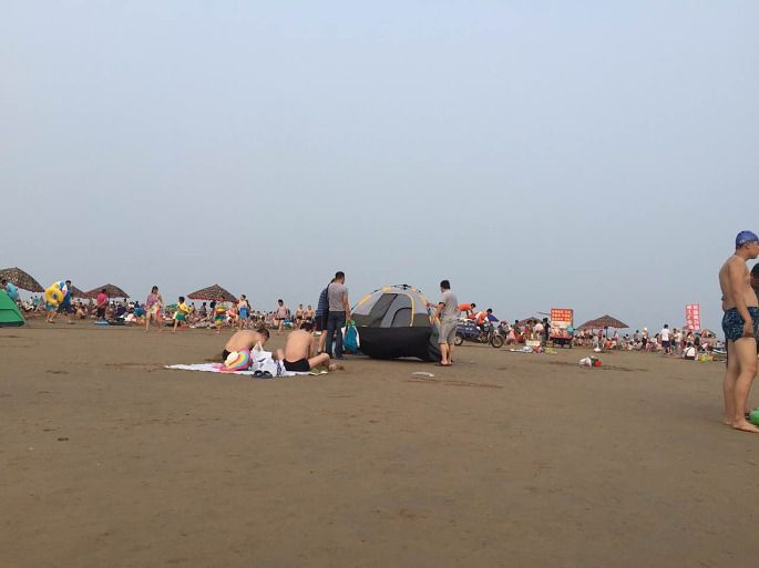 到了吴家台海滩,大概11点多,太阳很晒,于是又去租太阳伞,可是涨价了!!老板说,今天周5了!!前一天带躺椅,还有马扎。今天就配了个破草席……小马扎都不给!!