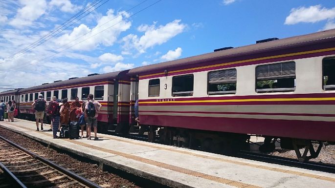 因为距离问题,我是到bang sue JN 坐的火车,车次很多 官网:http://www.thairailticket.com/esrt/Default.aspx?language=1 可以查询。卧铺较贵200多铢吧,站票网上说20铢,我去的那会下趟车是普快的,所以只要14铢,14铢啊!坐地铁到火车站都不够的说,上车有座就可以坐,没有空调,不过风吹吹,路上蓝天白云绿草看看的,很快就到了,俩小时吧。