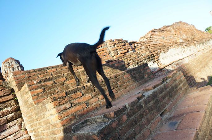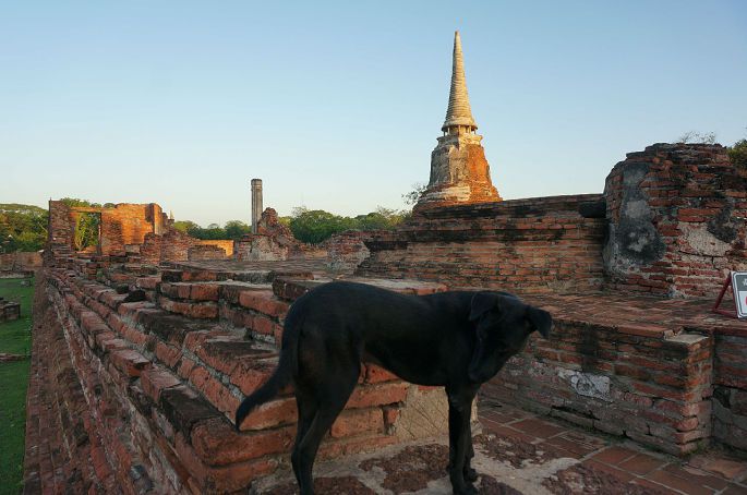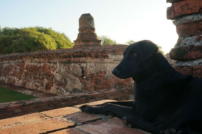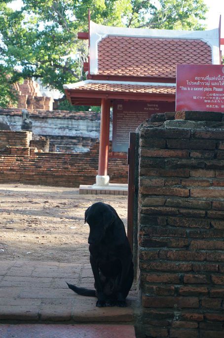 早上的玛哈泰很静,因为没有人,我没事拿着相机卡擦卡擦的时候,一直跛脚的狗跟在了身边,因为昨晚被狗追吓到了,起初我是怕它的,但它就绕在你身边,跑远了又跑回来,感觉像是带你游览玛哈泰。我拍照它就蹲在一边,我走动它就跑到前面,看我没跟上又折回来,有些寺庙台阶高,小黑跛脚没爬上去摔下来了,躺在地上,我摸摸它就起身继续向上爬,很棒的狗狗。最后到了“树抱佛头”,它就懒洋洋的躺在边上,临走的时候想要是它跟我走了,我就带它走。但是到了门口,不管我怎么叫它,它都站在那里不动了。后来又有游客进去,它又跑了进去做起了“导游”。突然让我想到了一个词“守护”,昨晚追我的狗狗们是守护它们的寺庙,小黑也是在守护玛哈泰。