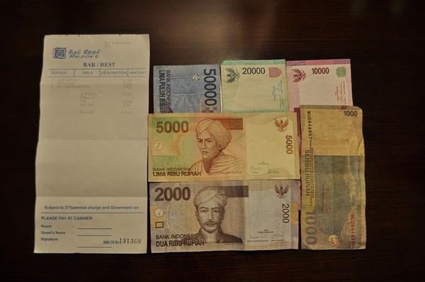 本地主要的纸币,缺一张10万元的,因为第一餐就把4张都用完了。
